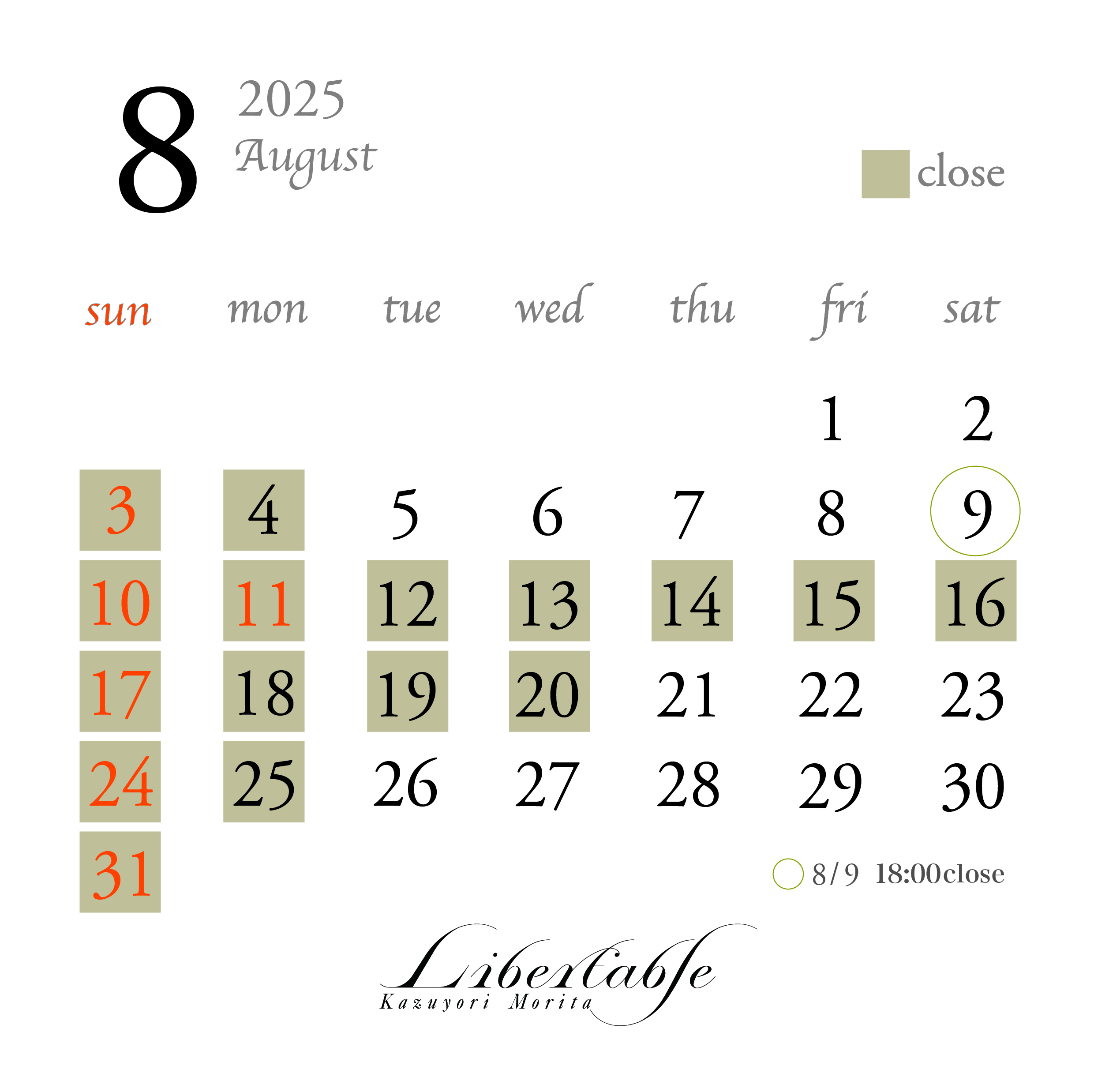 誠に勝手ながら2025年8月10日(日)〜8月20日(水)リベルターブルは夏期休業とさせていただきます。ご迷惑をおかけしますが、ご了承いただけますよう、何卒お願い申し上げます。また、8月9日は18時までの営業になります。 その他は定休日の日曜と月曜日休業致します。営業時間は11時から20時迄になります。 皆様のご来店お待ちしております。