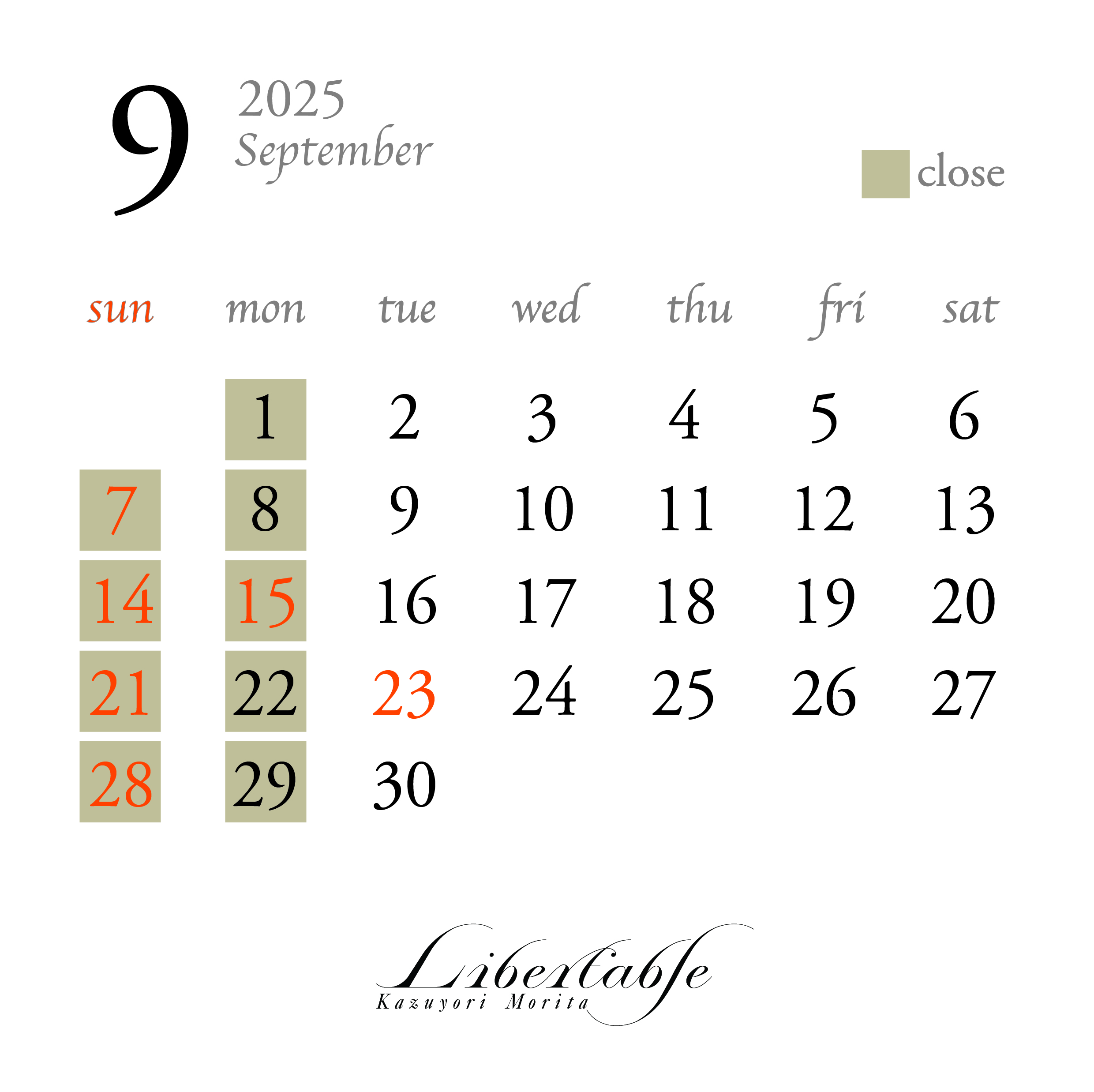 定休日の日曜と月曜日休業致します。 また、営業時間は11時から20時迄になります。 ランチの営業は金曜日・土曜日 12時一斉スタート 完全予約制 オンラインのみ一ヶ月前より予約可能です。カフェの営業は火曜・水曜日・木曜日11時から17時半L.O金曜〜土曜日ランチ営業後の15時から17時半L.Oオンラインのみ3日前より予約可能です。お電話やメールでのご予約はできません。 皆様のご来店お待ちしております。