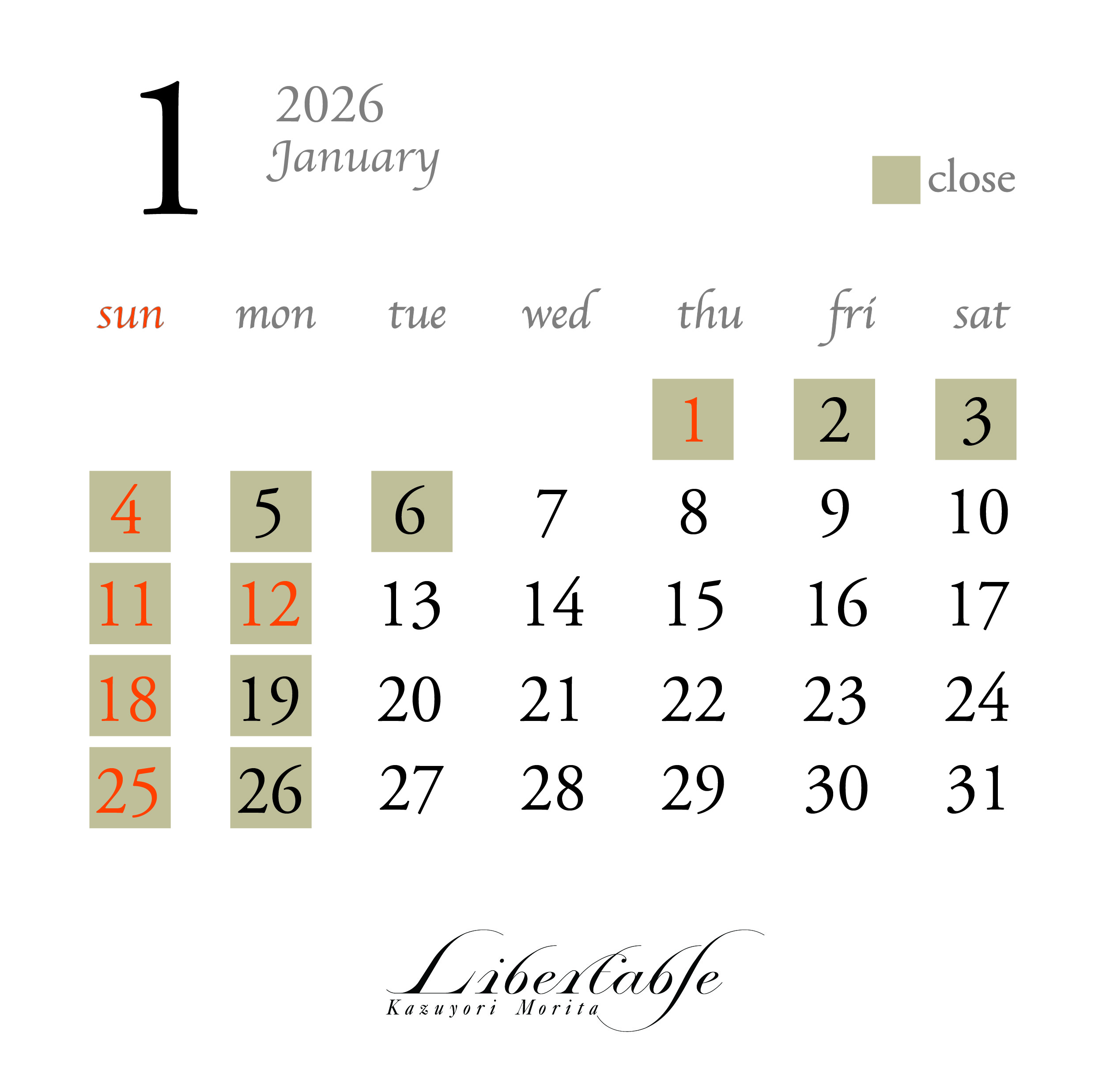 定休日の毎週日曜日と月曜休業いたします。営業時間は11時から20時までになります。 2025年12月28日日曜日〜2026年1月6日迄は冬季休業で休業いたします。また、12月27日土曜日は18時で閉店になります。 よろしくお願いします。